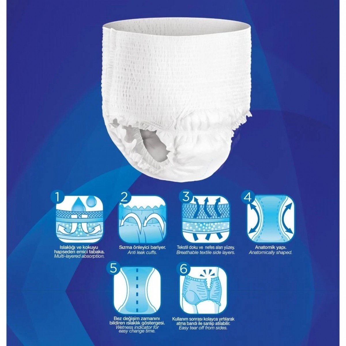 • Islaklık ve kokuyu hapseden özel emici tabakası sayesinde kuru ve güvende hissettirir.