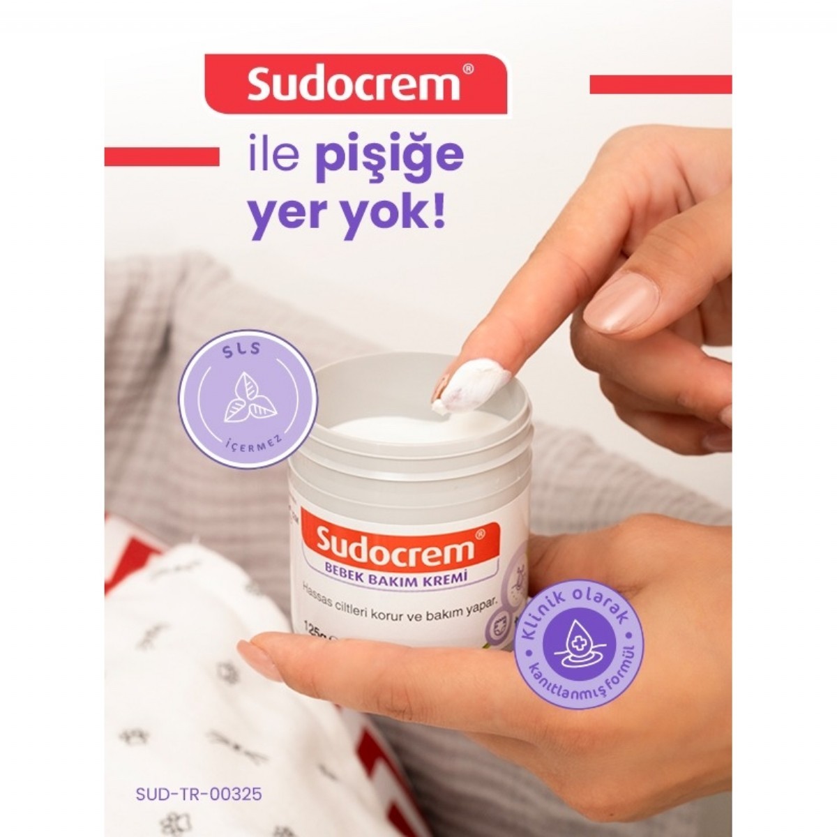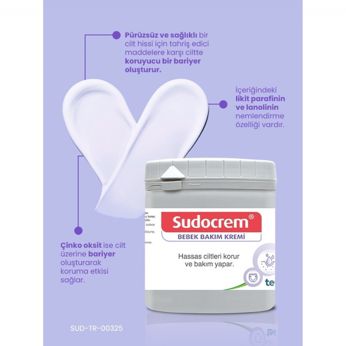 Sudocrem Cilt Bebek Bakım ve Pişik Kremi, hassas ciltler için özel olarak formüle edilmiştir. Yumuşak dokusu sayesinde ciltte koruyucu bir bariyer oluşturarak cildin rahatlamasına yardımcı olur.
